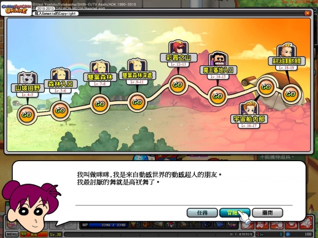 巴哈姆特 GNN 先用小新的動感假面來挑戰小新家附近巷子的「宇宙船內部」,在這個關卡將由「高衩魔王」的得意手下「腹卷女郎」現身應戰。整個關卡以科技風為主,玩家要在每一小關中打倒所有的敵人,然後才能開啟前往下一階段的門,玩家可以選擇小關卡前進的方向、以便到達有魔王的關卡。操作動感假面的小新時,可以使出多樣化技能,像是變身劍道少年或是變身棒球選手揮棒攻擊、變身成野豬猛衝、使用飛龍斬,當然還有就是變身動感假面來使出動感光束攻擊對手。